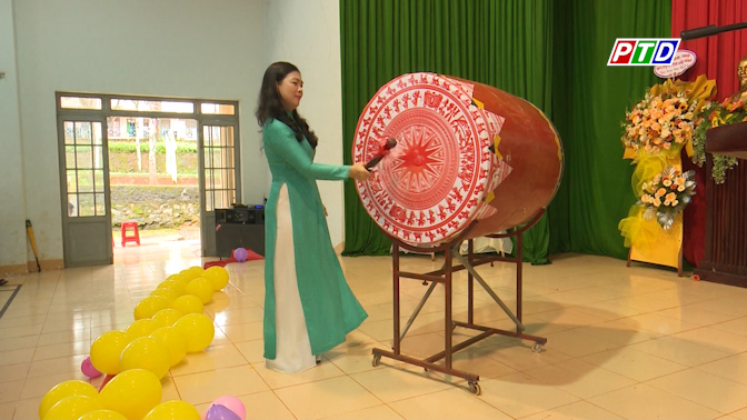 Hiệu trưởng Trường THPT Dân tộc Nội trú N’Trang Lơng Đỗ Thị Việt Hà đánh hồi trống khai trường