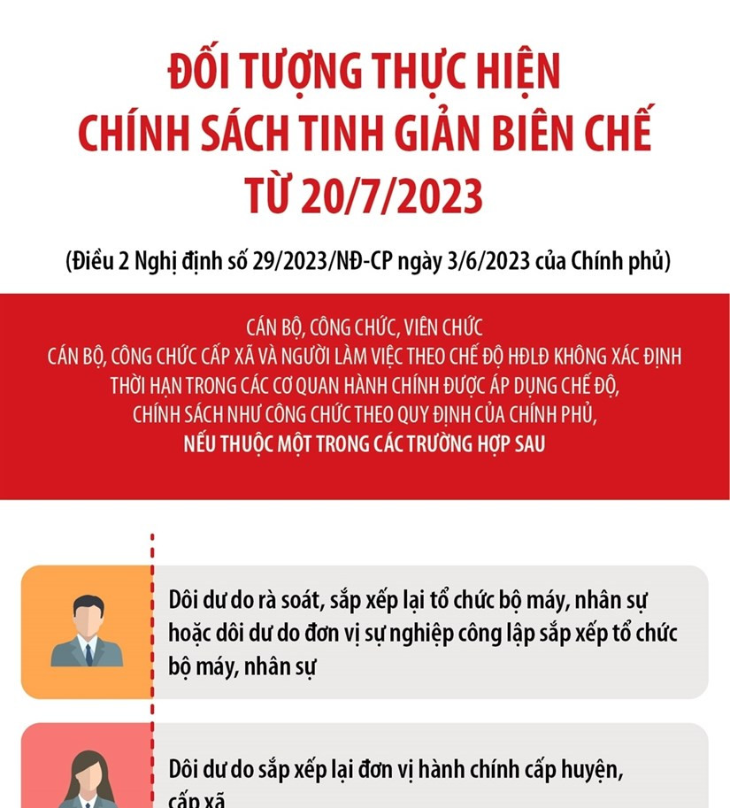 Nghị định số 29/2023/NĐ-CP ngày 3/6/2023 của Chính phủ quy định về tinh giản biên chế, có hiệu lực từ ngày 20/7/2023, trong đó có quy định về Đối tượng thực hiện chính sách tinh giản biên chế.